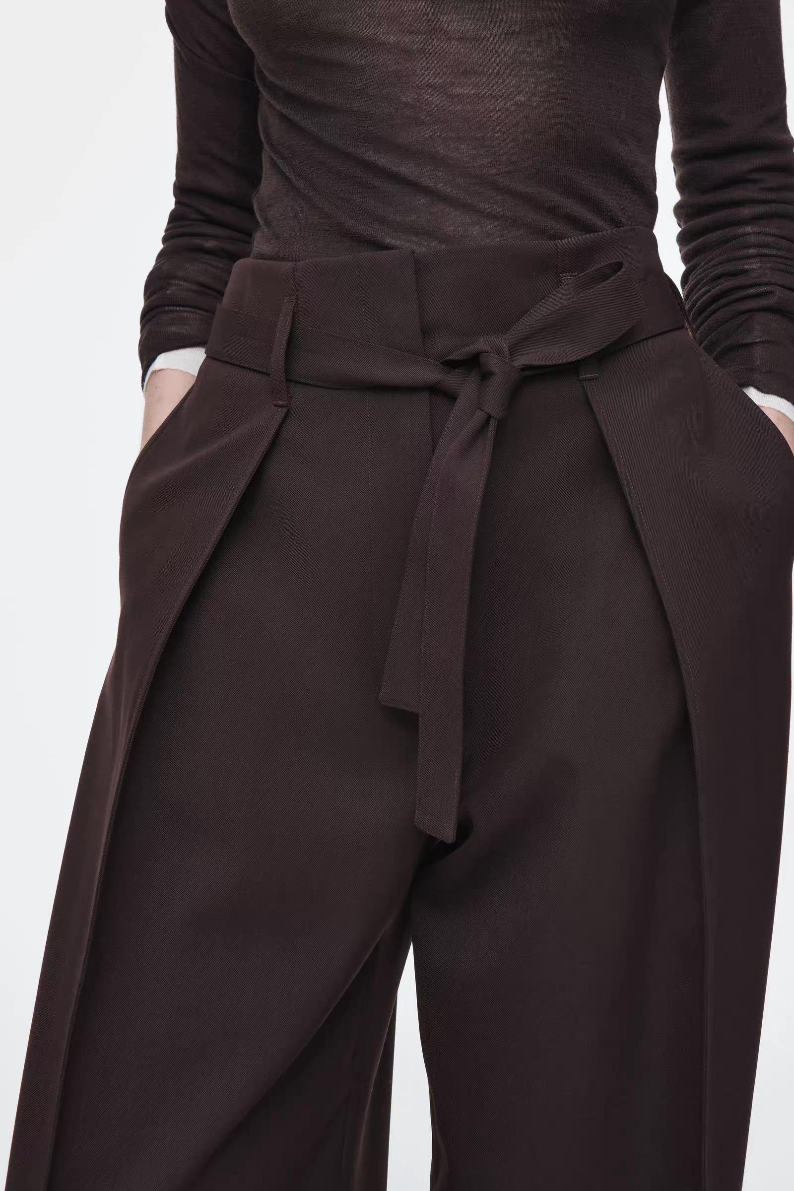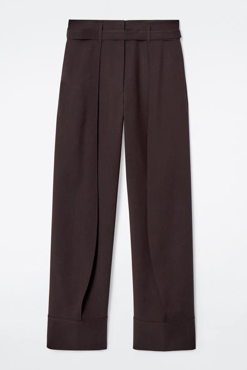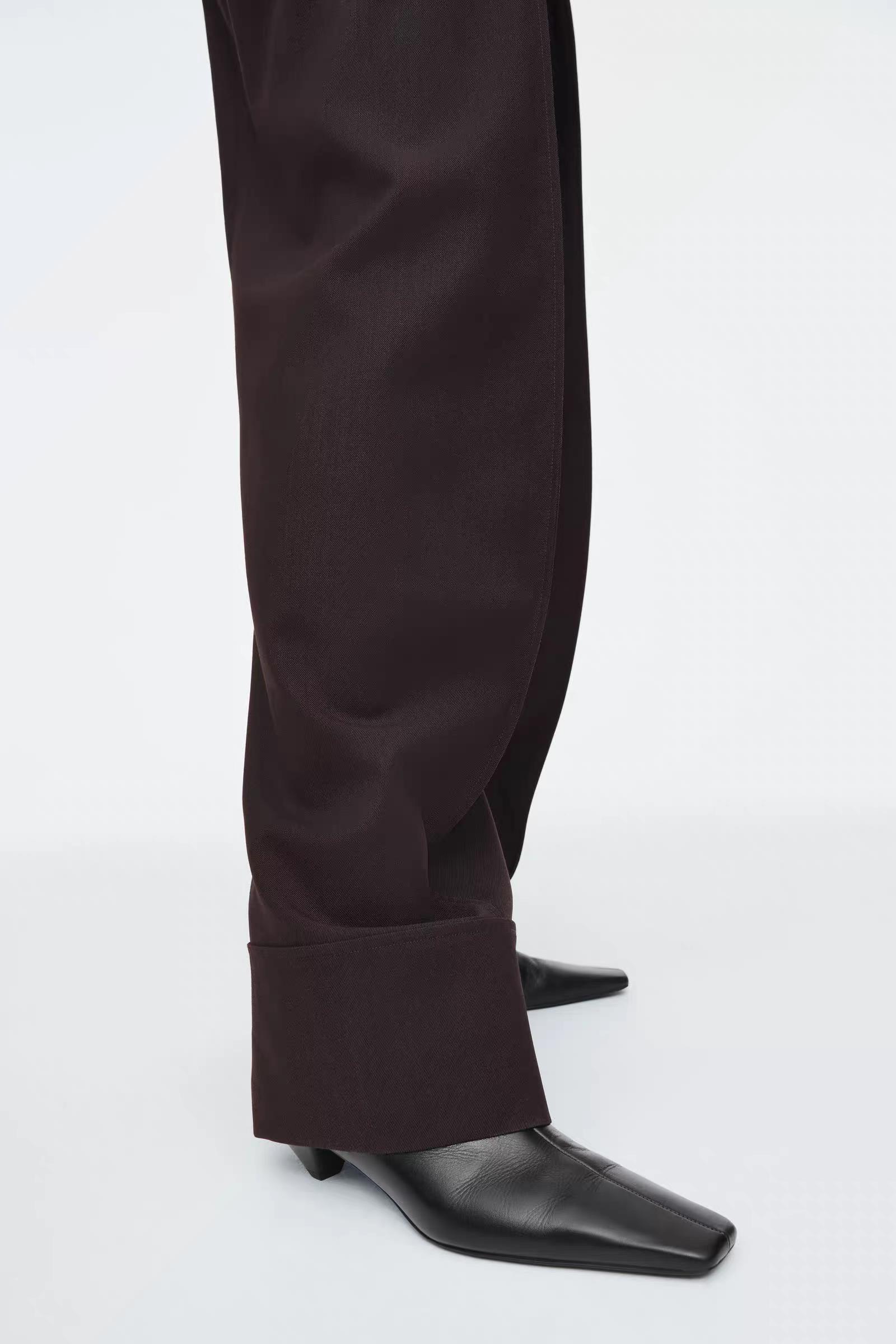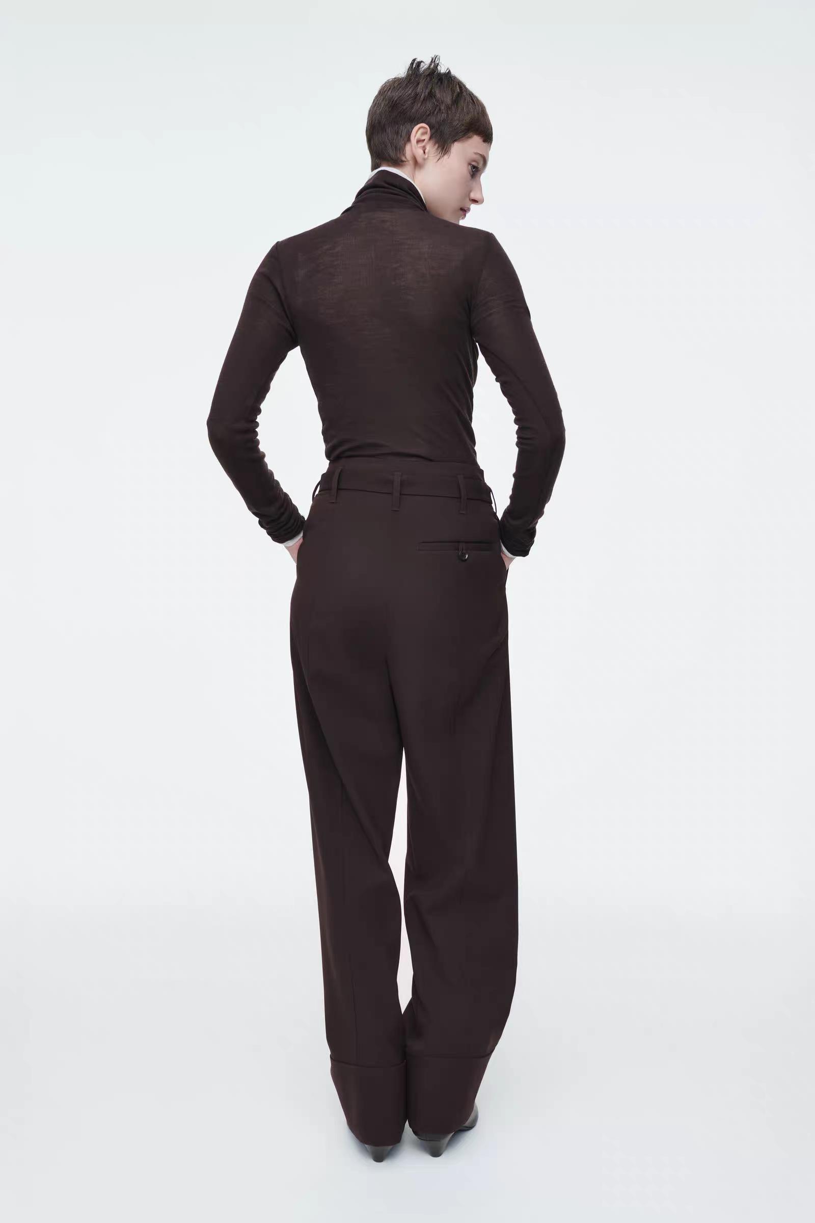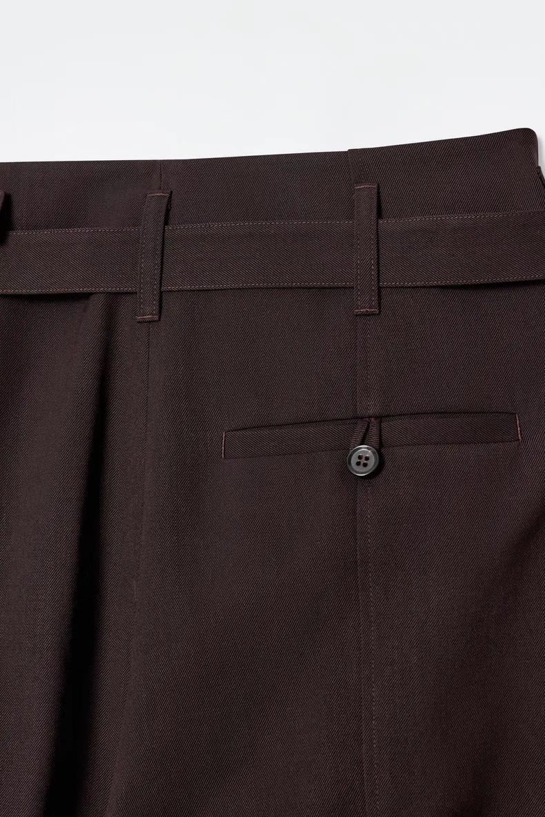 Артикул:1246548001 Состав:55% переработанный полиэстер, 45% шерсть. Эти современные брюки изготовлены из саржала, содержащего шерсть, сертифицированную RWS.Они имеют зауженние к низу, складки спереди и регулируемую талию -Нормальный фасон -Застежка-молния на крючке и молнии ; Длина внутреннего шва для размера EU 36 составляет 75,5 см / Модель надела размер EU 36"