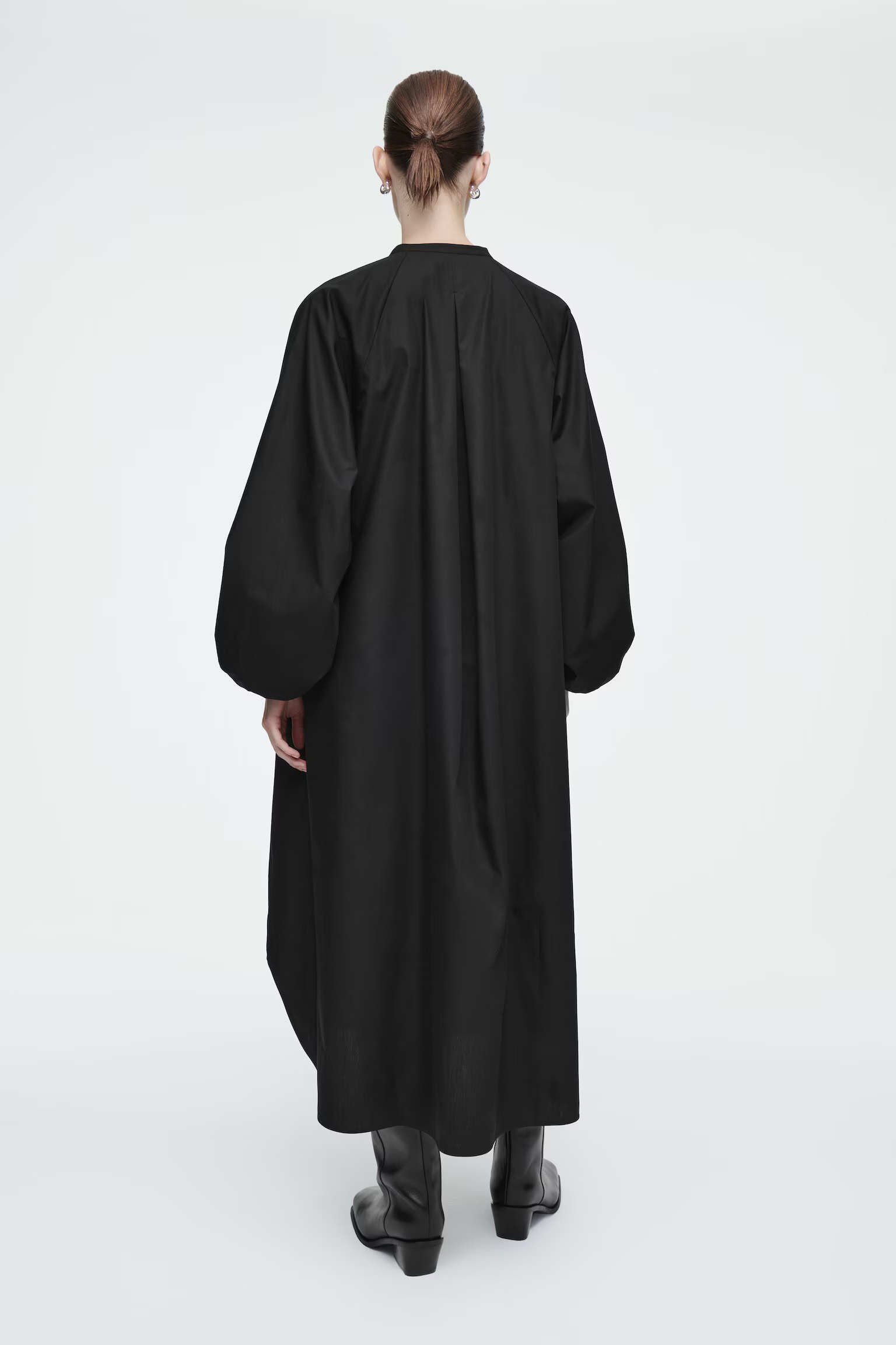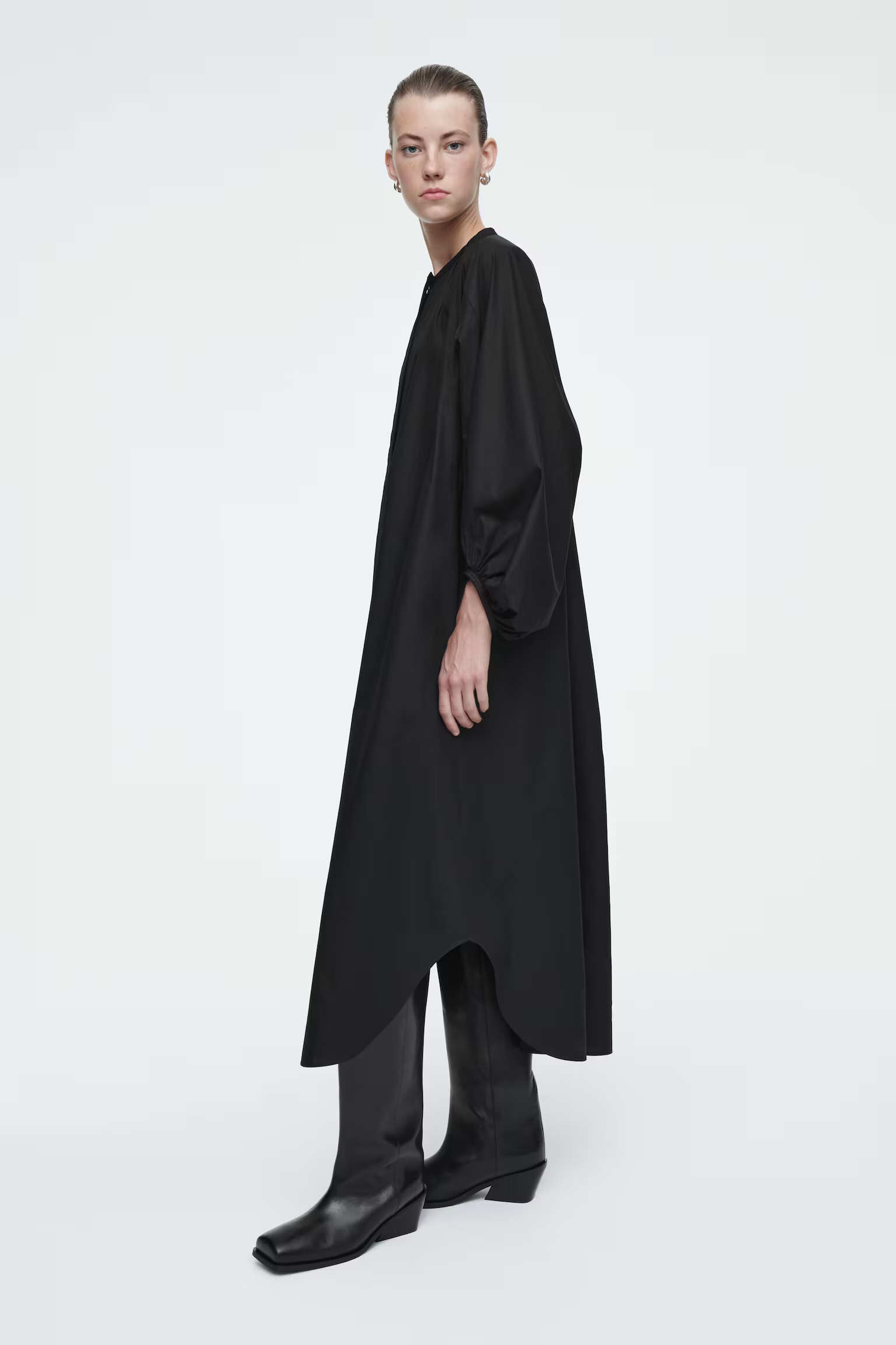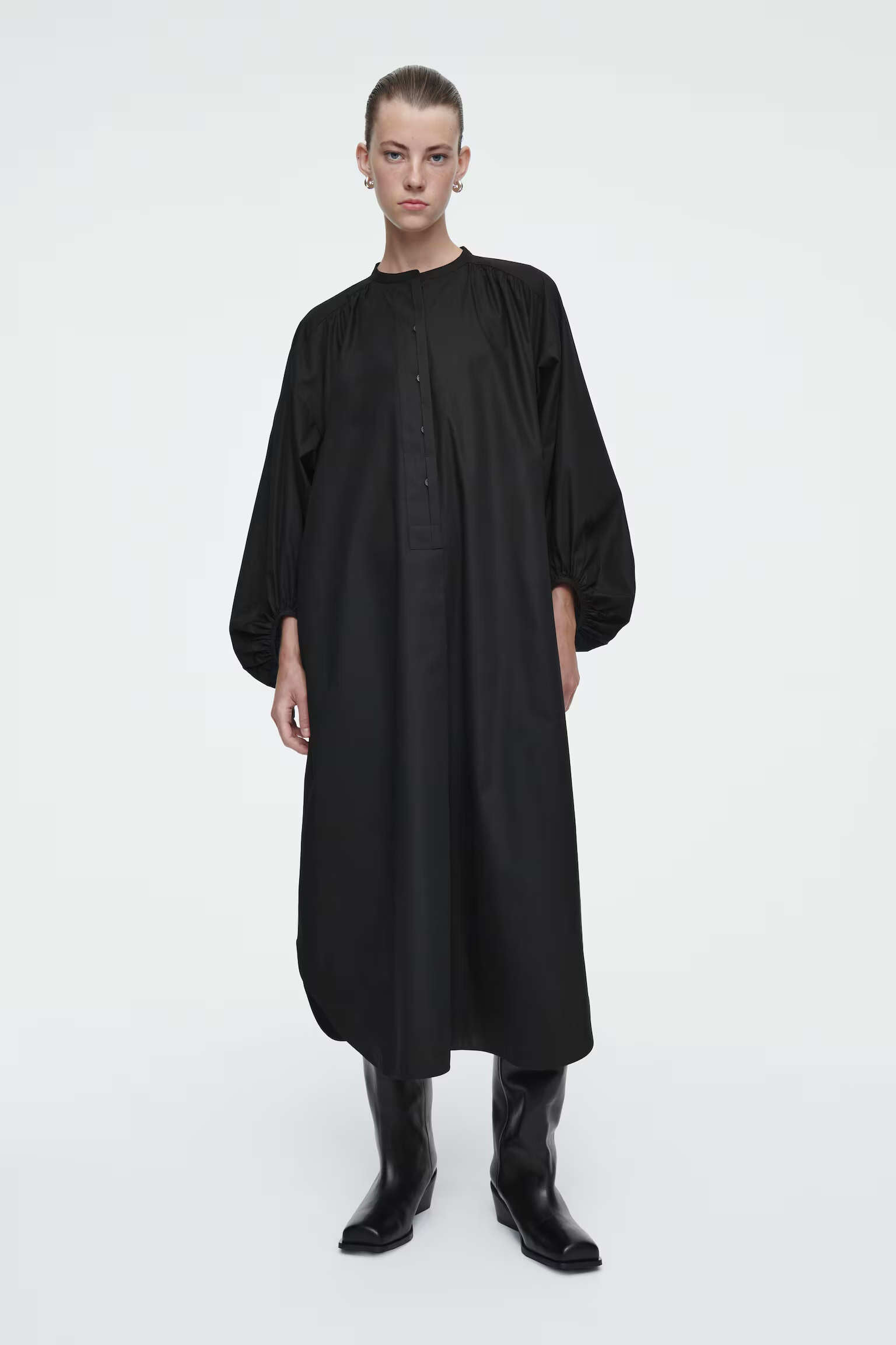 Артикул:1266873001 Состав:100% хлопок Свободный крой. Рукава-баллон. Оно изготовлено из натурального мягкого и легкого органического хлопка. Длина сзади для размера EU 36 126 см / Модель одет размер EU 36