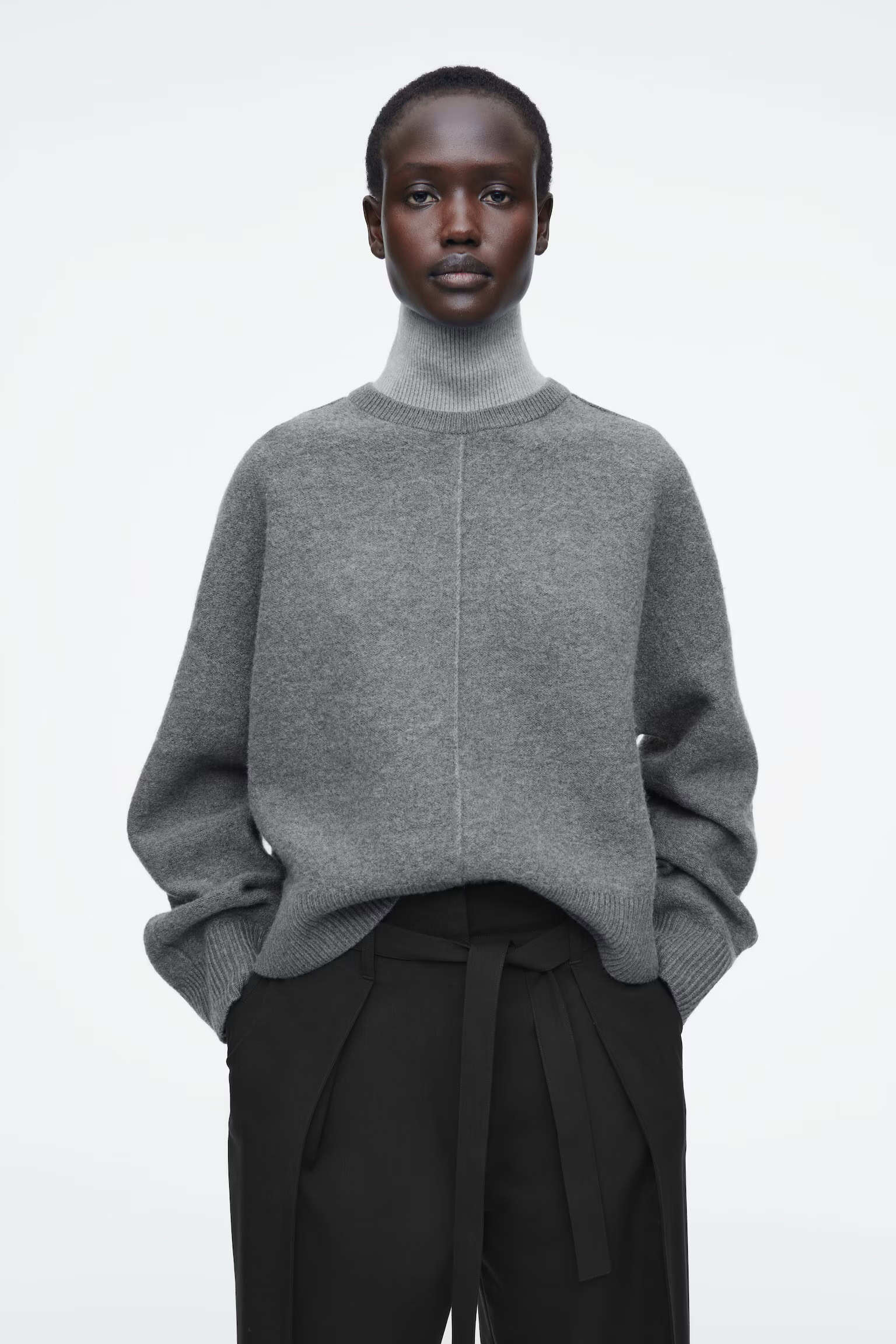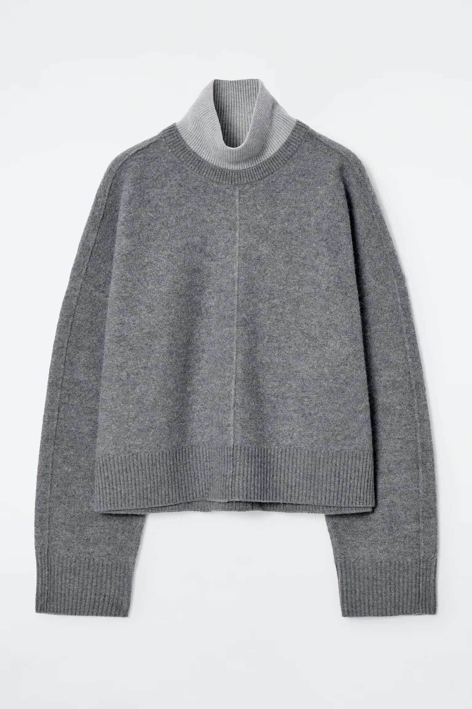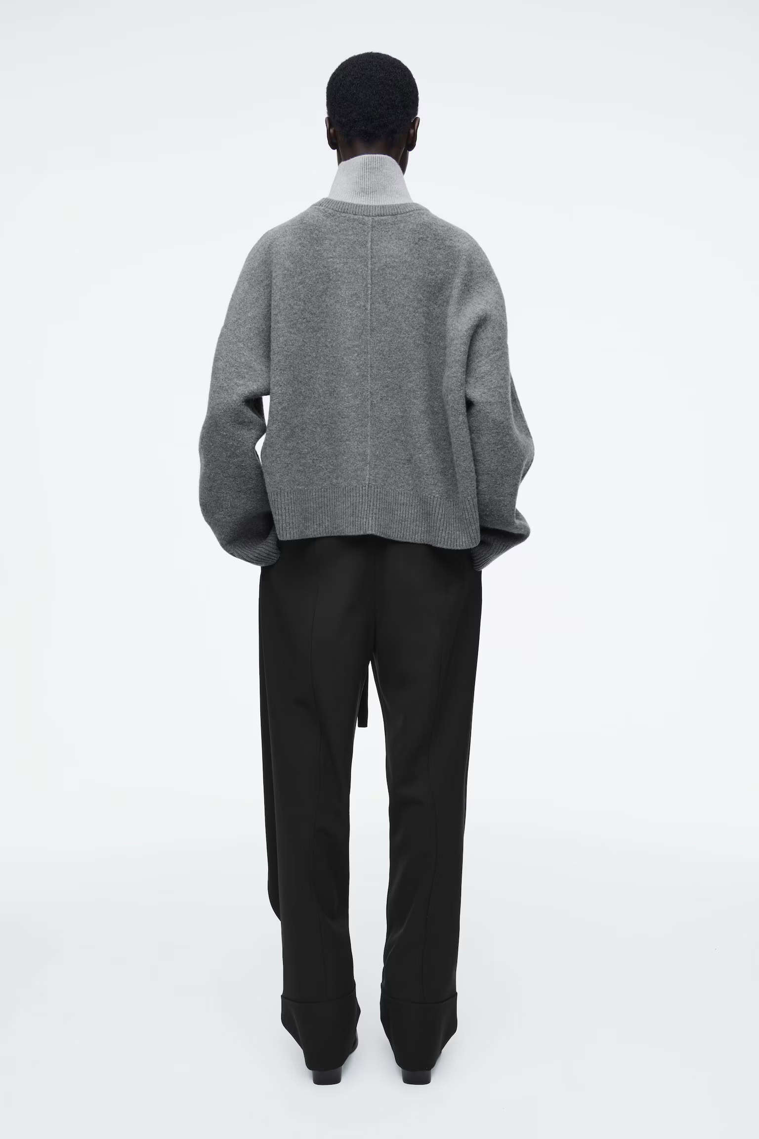 Артикул:1258656001 Состав:100% шерсть Этот двухцветный свитер в тонких оттенках серого изготовлен из чистой шерсти, сертифицированного RWS. Он имеет свободный крой и высокий многослойный воротник. -Свободный фасон; Длина спереди для размера S составляет 55 см / Модель одета в размер S"