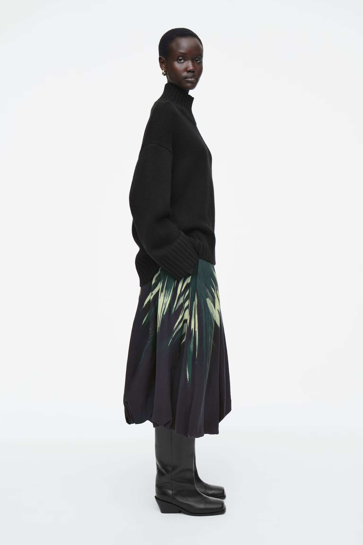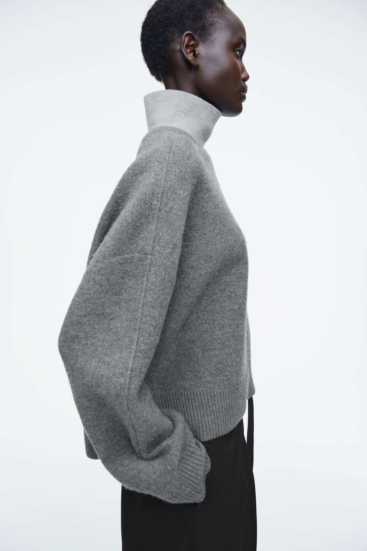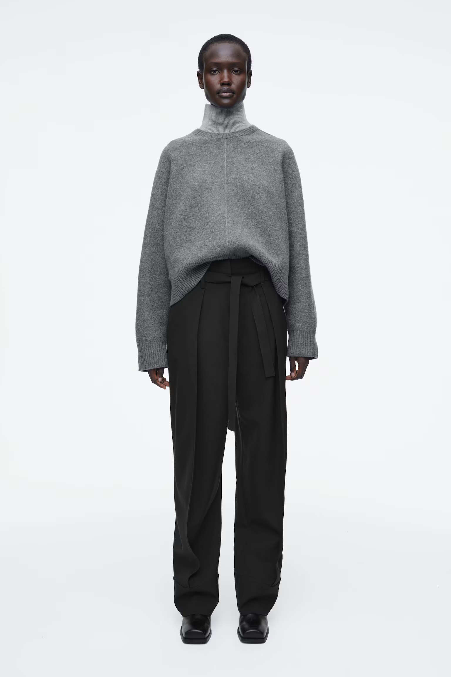 Артикул:1258656001 Состав:100% шерсть Этот двухцветный свитер в тонких оттенках серого изготовлен из чистой шерсти, сертифицированного RWS. Он имеет свободный крой и высокий многослойный воротник. -Свободный фасон; Длина спереди для размера S составляет 55 см / Модель одета в размер S"