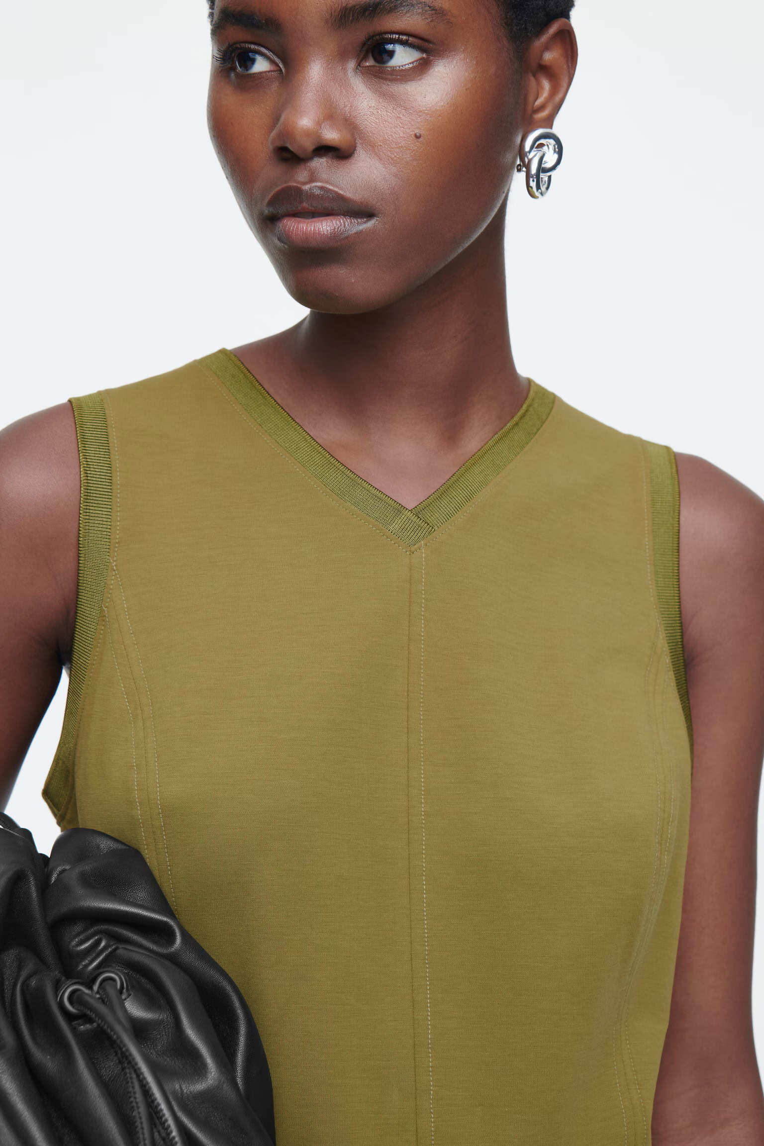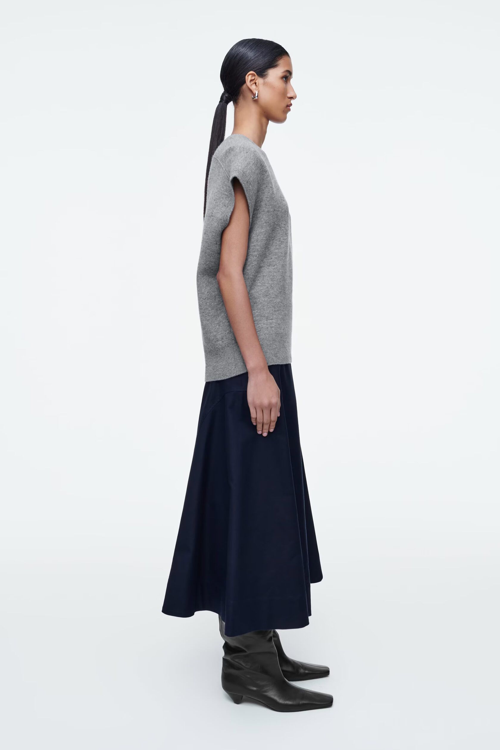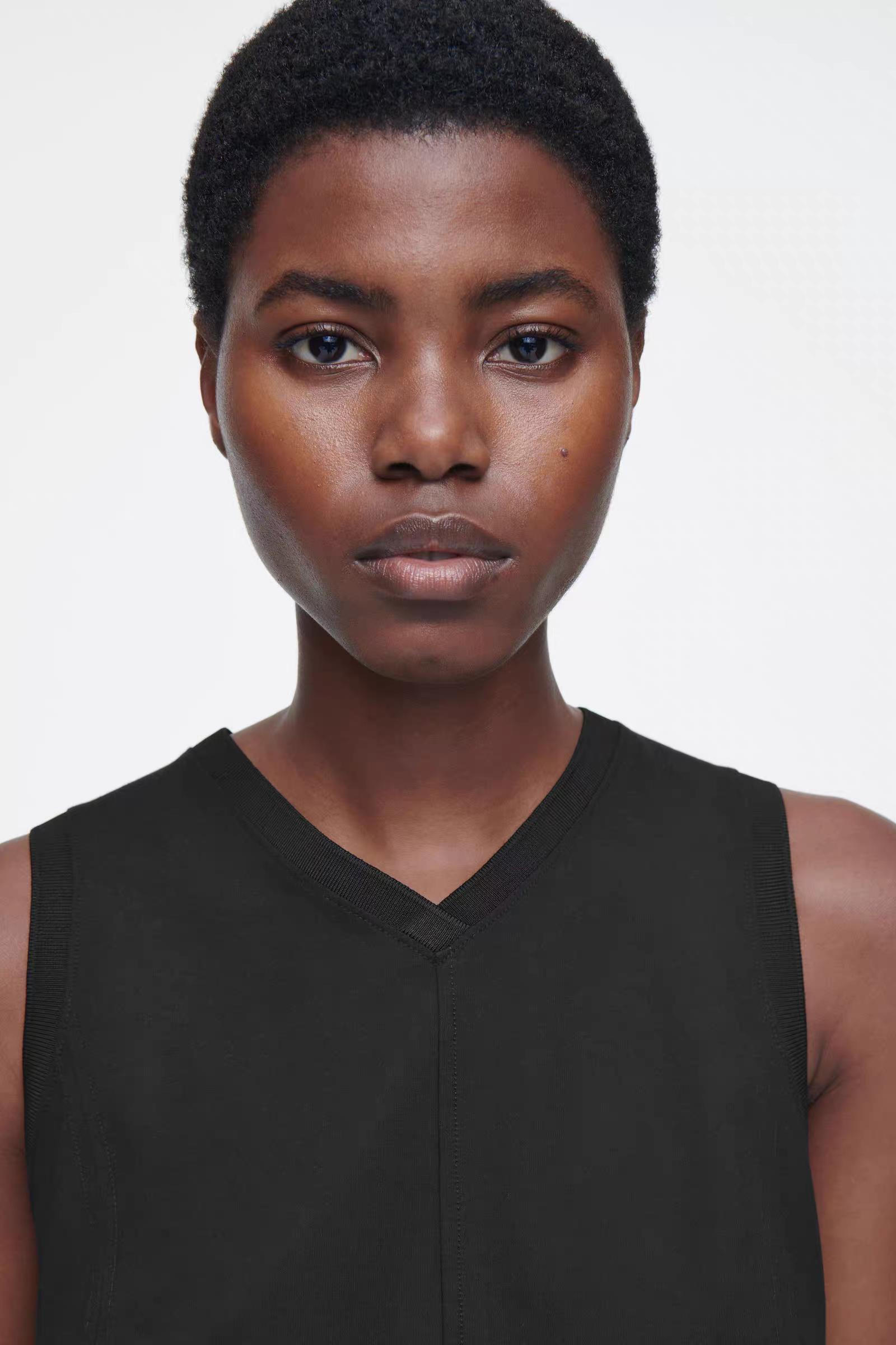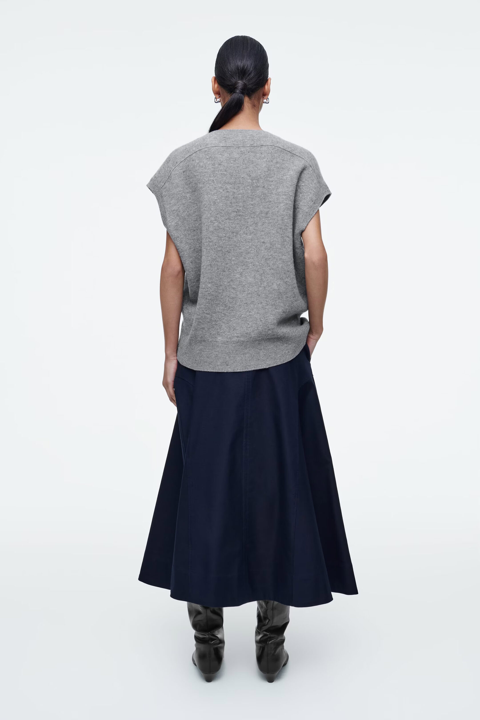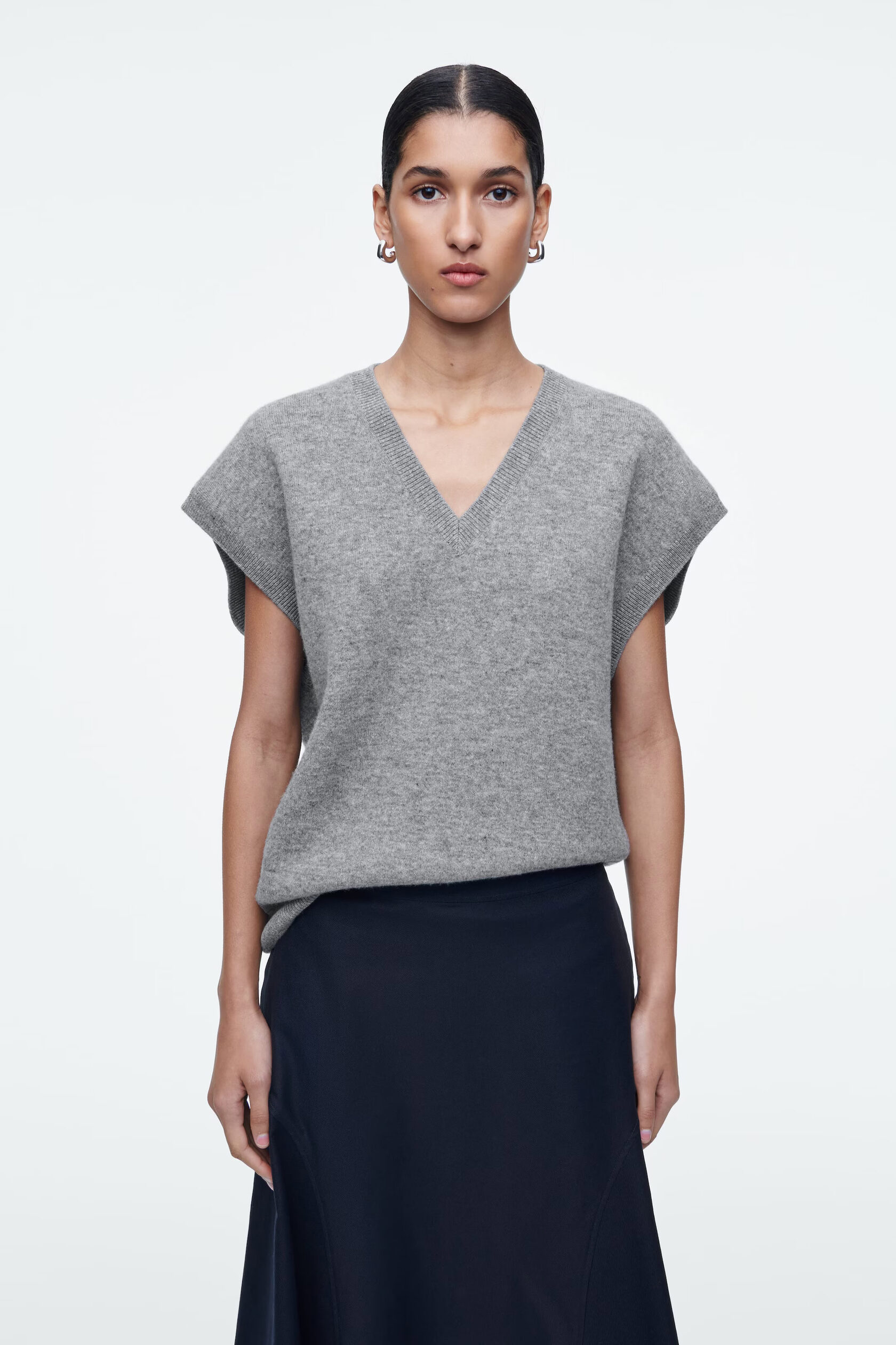 ЖИЛЕТ ИЗ ДВУХСТОРОННИЙ ИЗ ШЕРСТИ Артикул:1264919002 Состав:95% шерсть , 4% полиамид (нейлон), 1% эластан. Жилет изготовлен из двухстороннего трикотажа с шерстяным материалом, сертифицированным RWS. Он имеет округлую форму, V-образный вырез, короткие рукава и ребристую отделку. -Свободный фасон. Длина сзади для размера S составляет 59 см / Модель одета в размер S"