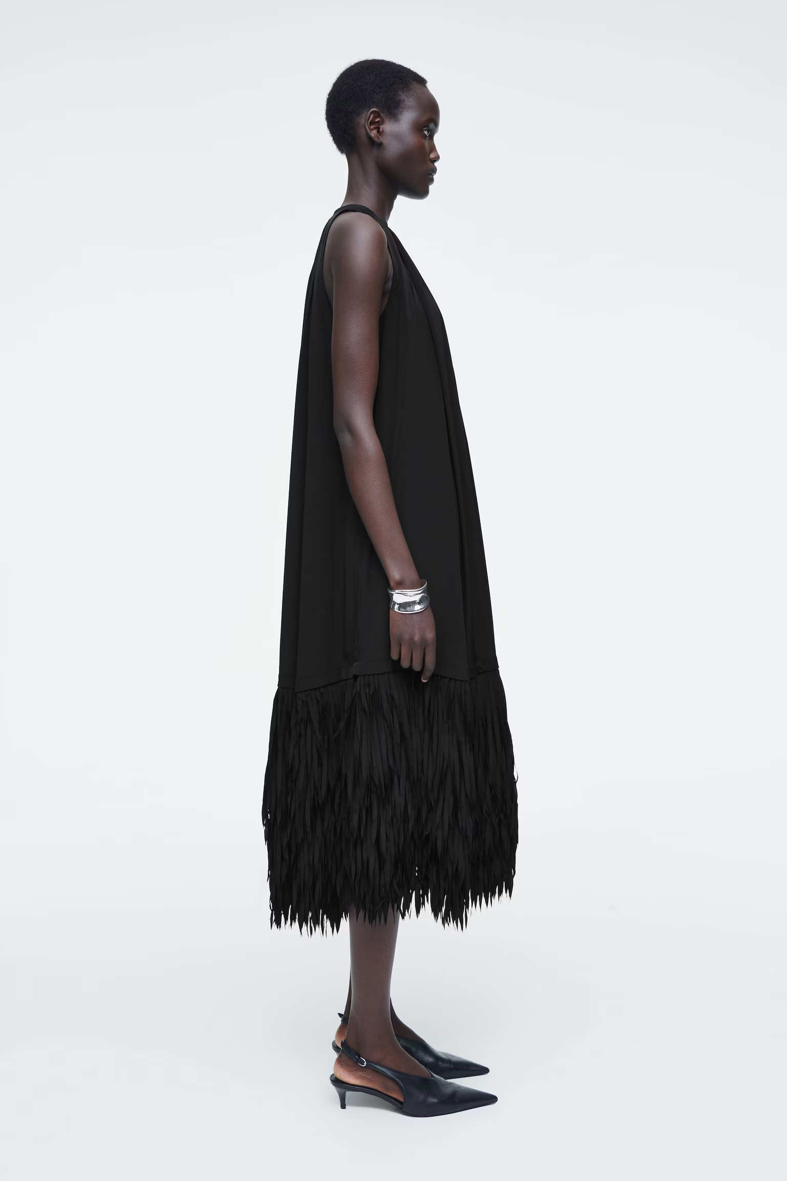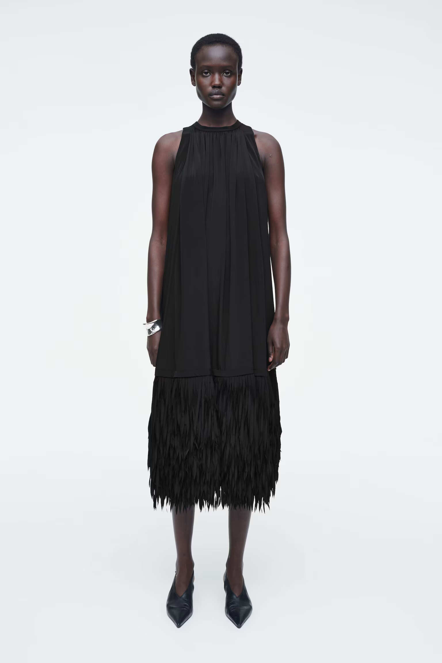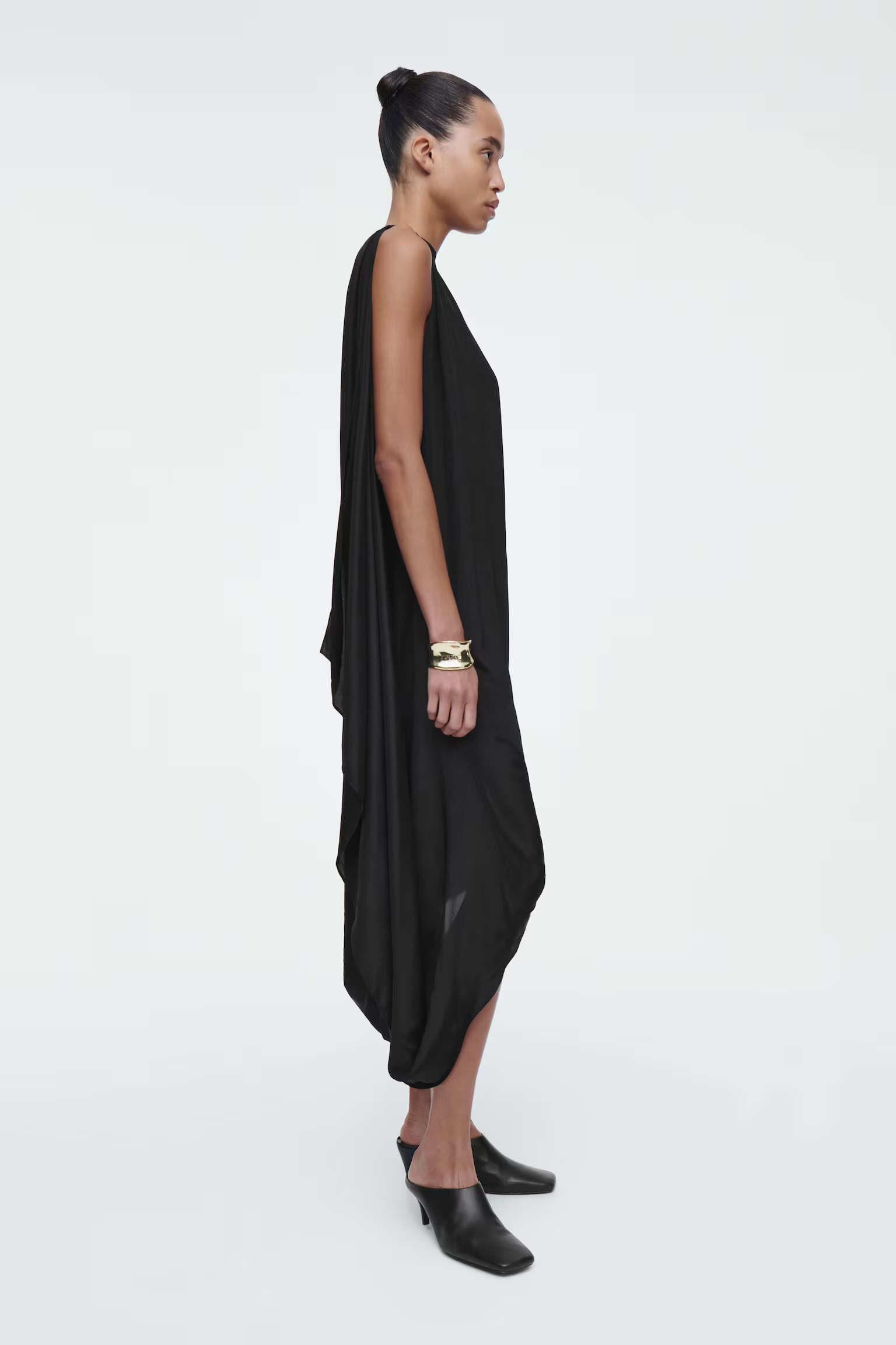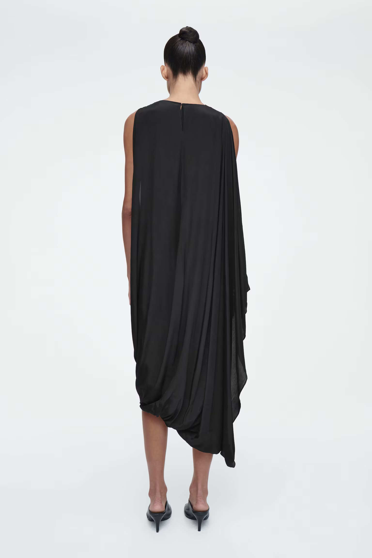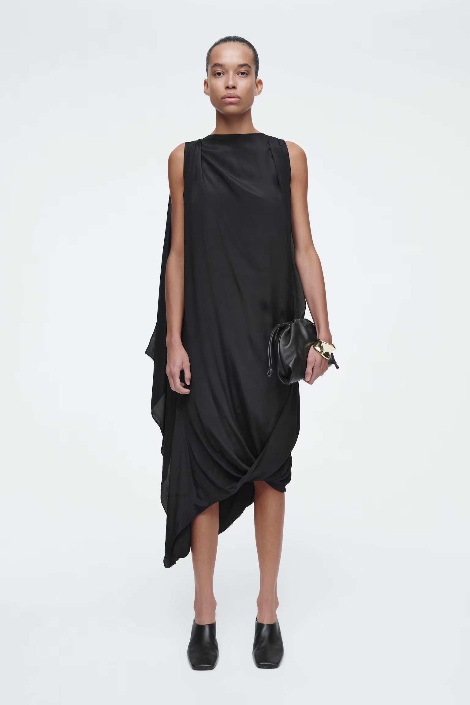 Артикул:1244536001 Состав:4% вискоза, 26% шелк тутового. Подкладка: 100% переработанный полиэстер. Это платье, выполненное из крепа, содержащего шелк, имеет свободный вырез и асимметричную драпировку, подчеркивающую характер ткани. -Свободный фасон, длина миди Застежка на крючке; Длина сзади для размера EU 36 составляет 110,5 см / Модель одет размер EU 36"