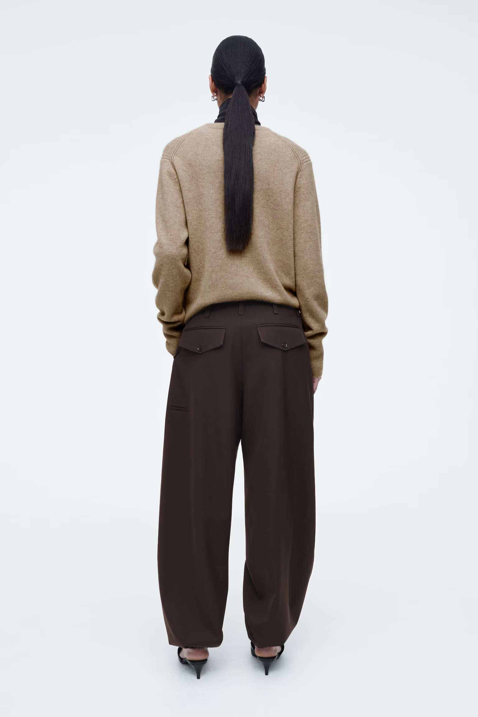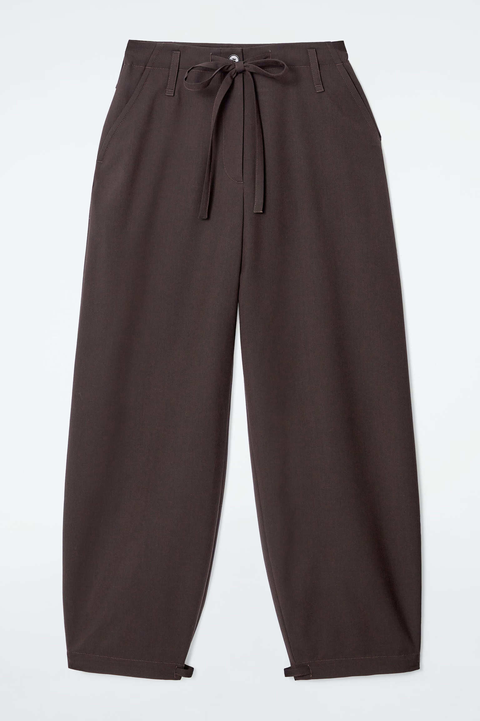 Артикул:1258984001 Состав:57% переработанный полиэстер, 42% шерсть, 1% LYCRA® Эти брюки цвета эспрессо имеют характерный крой - обратите внимание на штанины типа barrel. Они изготовлены из саржа, содержащего шерсть, сертифицированную RWS и имеют шнурки на талии и в нижней части ног, которые позволяют изменять их форму. -Свободный фасон Застежка-молния; Внутренняя длина штанины для размера EU 36 составляет 71,5 см / Модель носит размер EU 36"