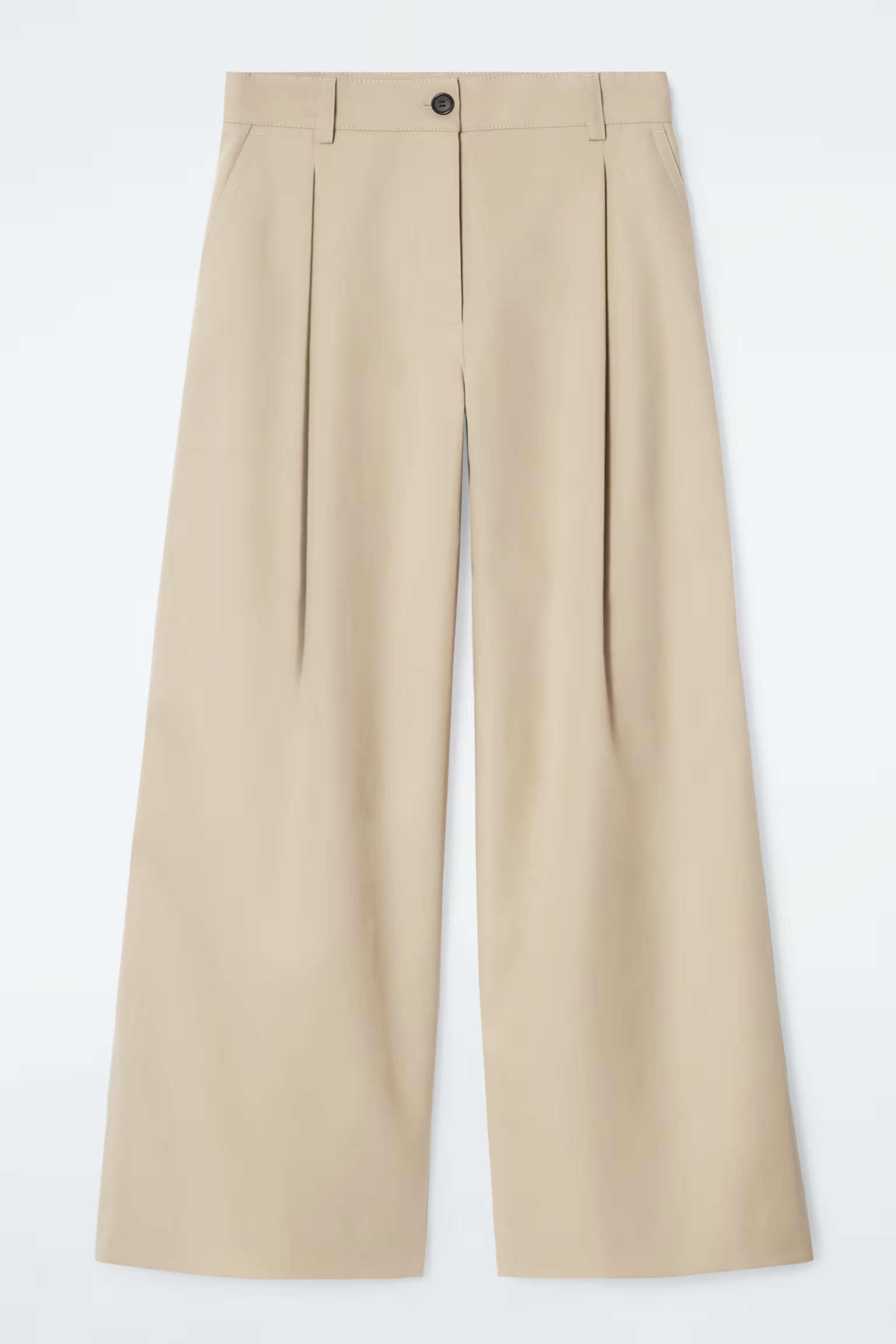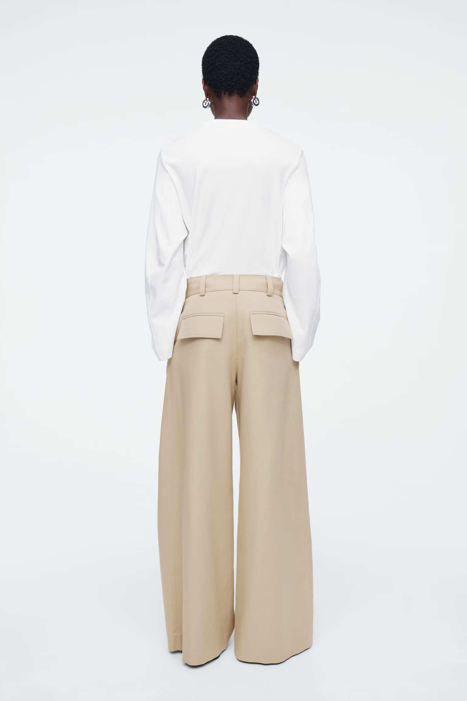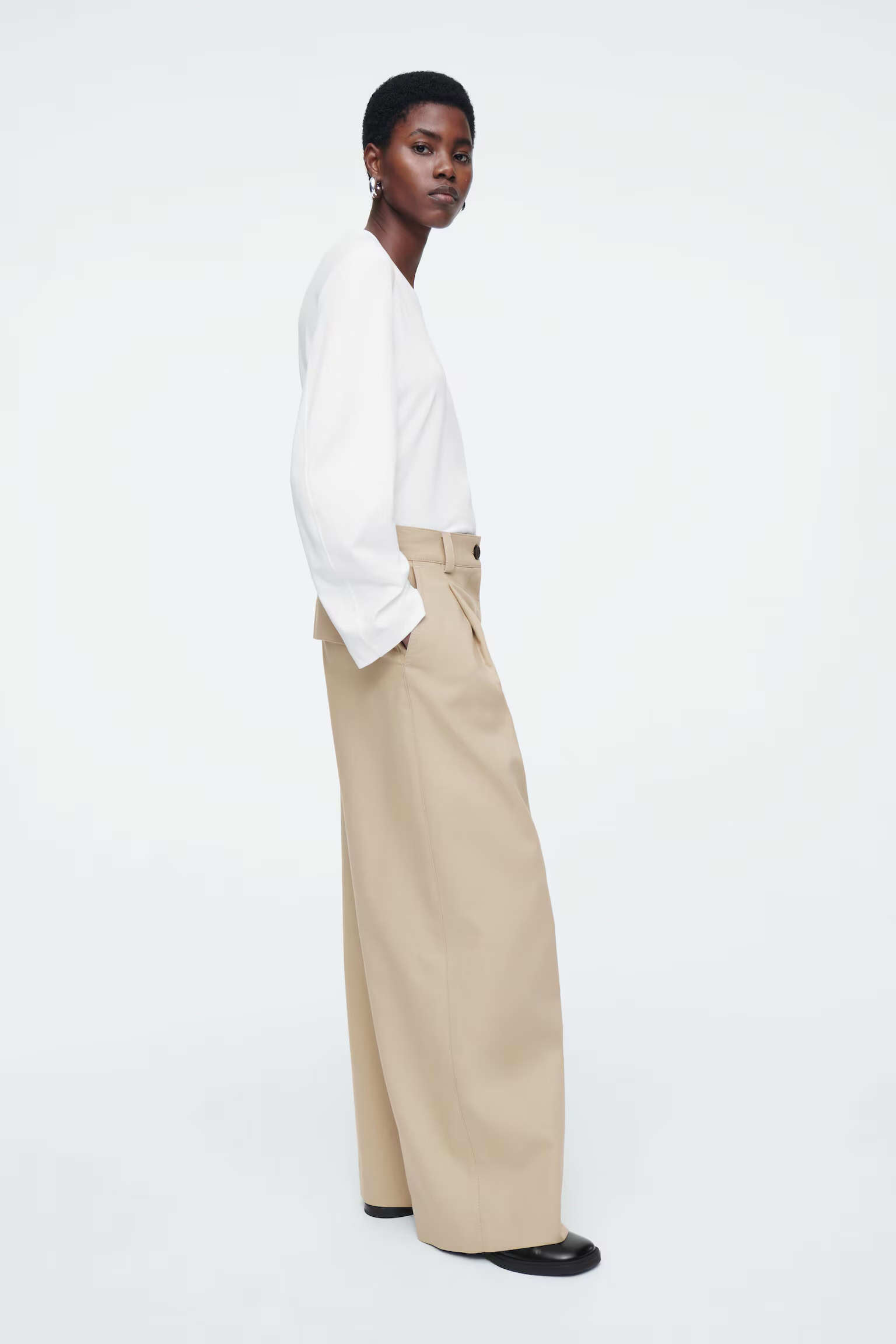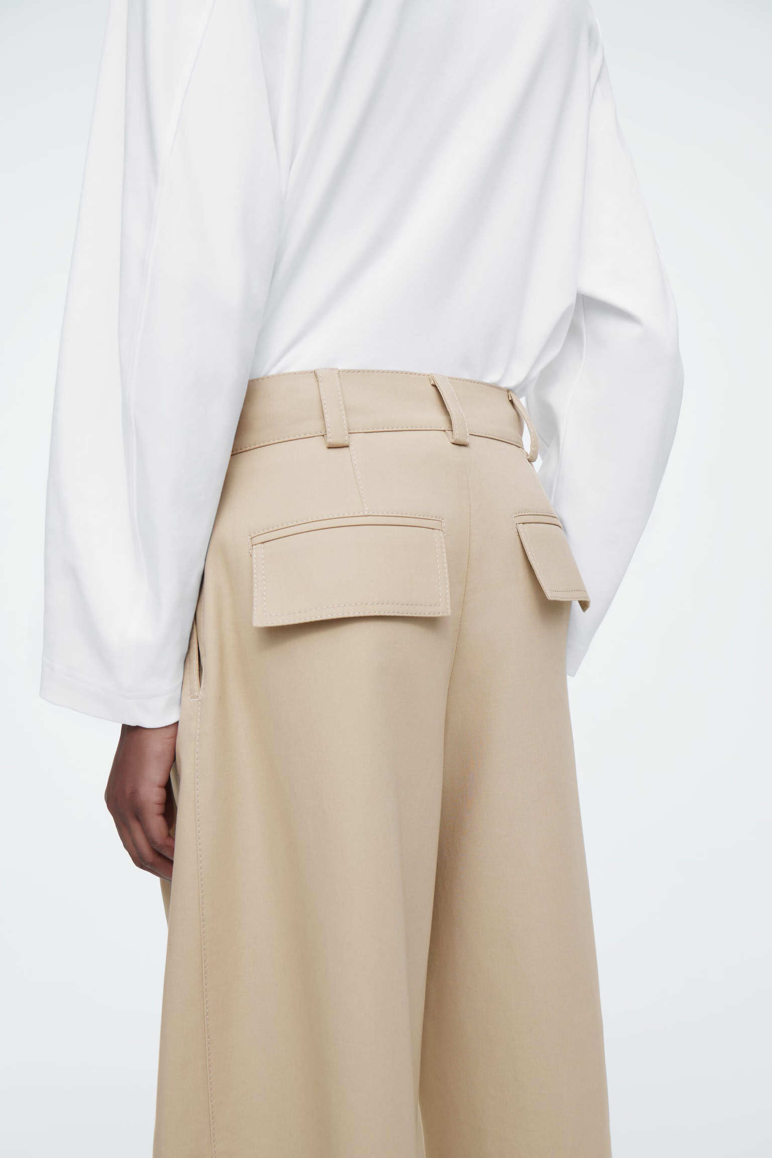 Артикул:1242910001 Состав:100% хлопок Эти хлопковые брюки нежного бежевого цвета . Они имеют свободный крой, широкие штанины, острые складки спереди, наклонные боковые карманы и карманы с клапаном сзади.Внутренняя длина штанины для размера EU 36 составляет 75 см / Модель носит размер EU 36