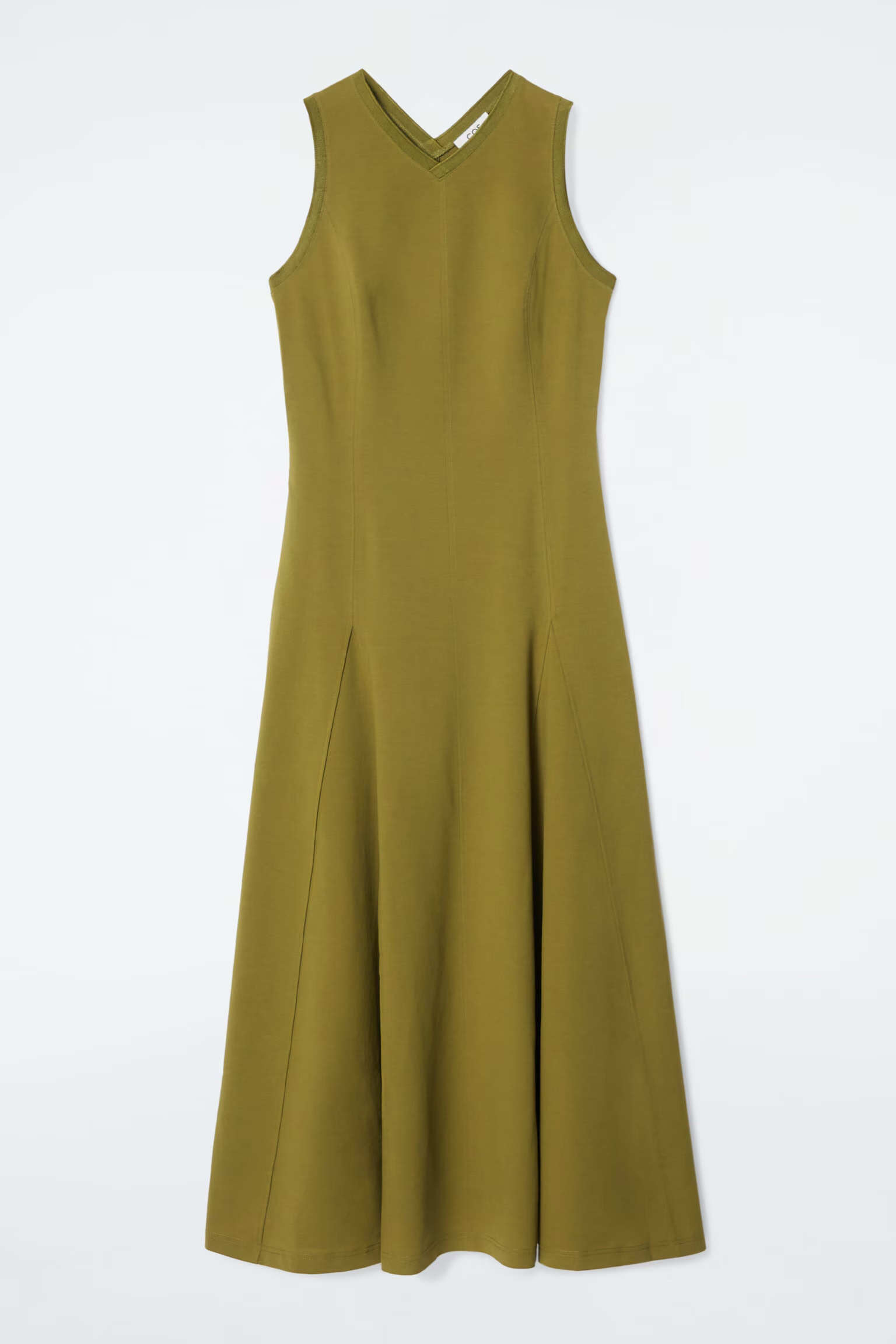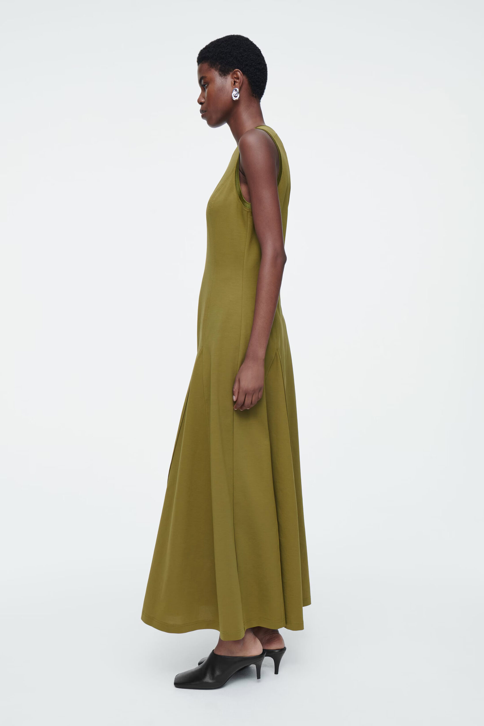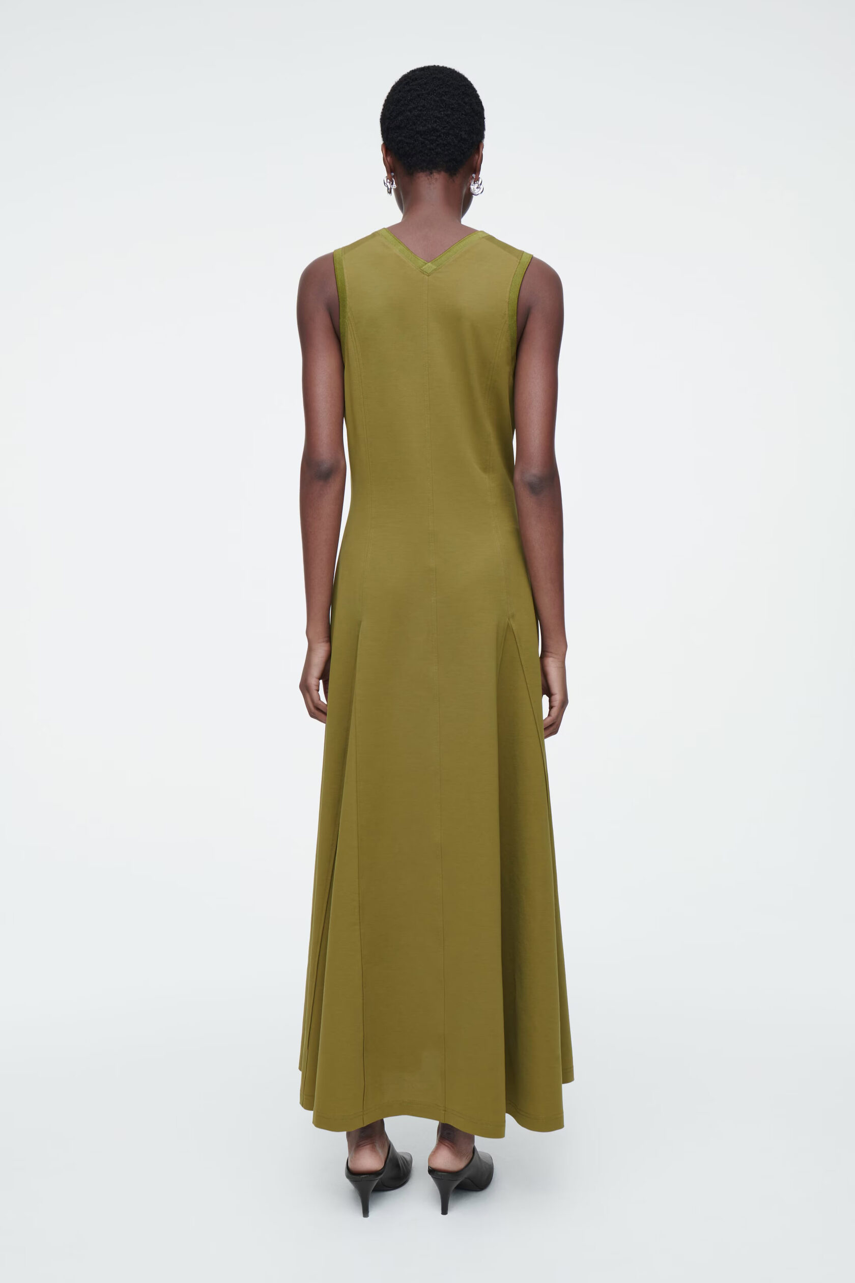 ПЛАТЬЕ МАКСИ ИЗ ДЖЕРСИ С РАСШЕШЕННЫМ НИЗОМ Артикуль:1231626003 Платье-макси оливкового цвета выполнено из мягкого хлопкового трикотажа. Модель имеет приталенный крой, V-образный вырез и складки. Узкий крой Состав: 59% хлопок, 25% полиэстер, 16% эластан. За исключением отделки/Машинная стирка Длина сзади для размера S составляет 125 см.На модели размер S."