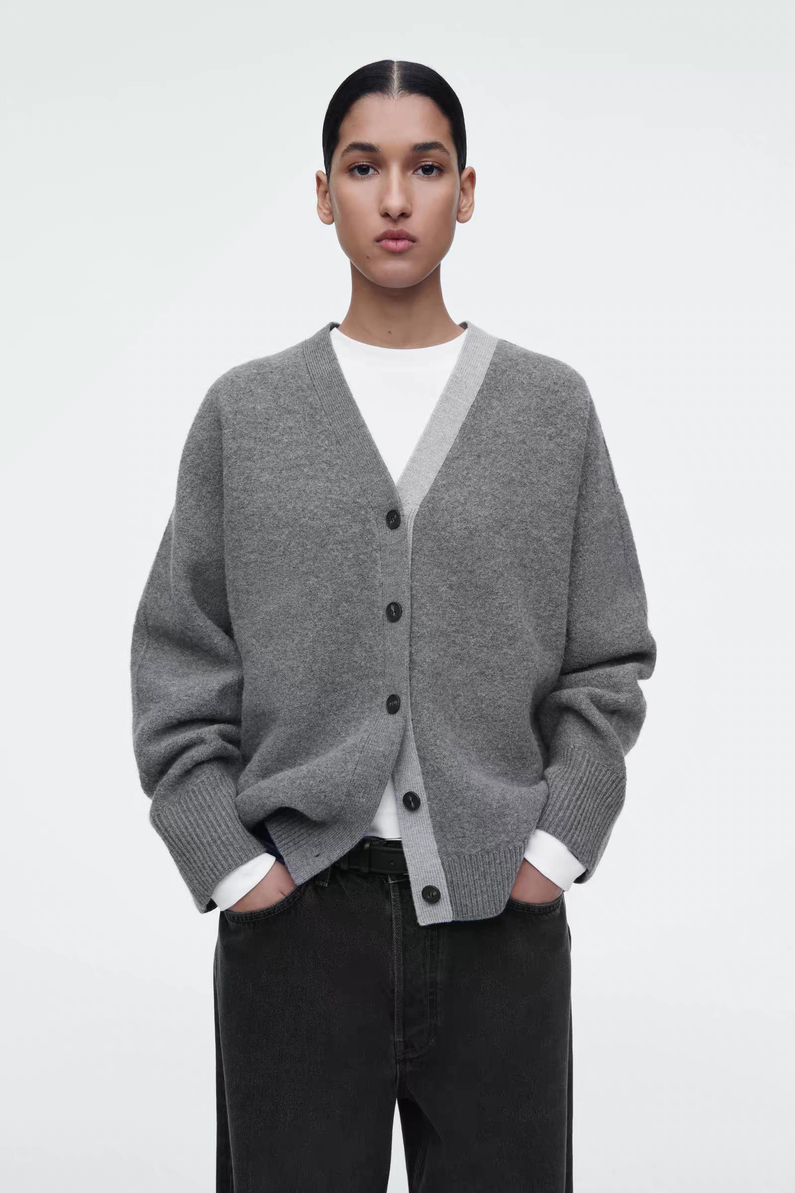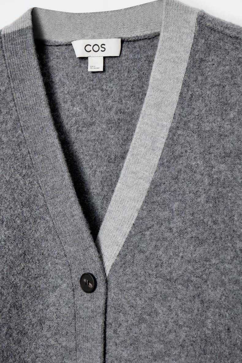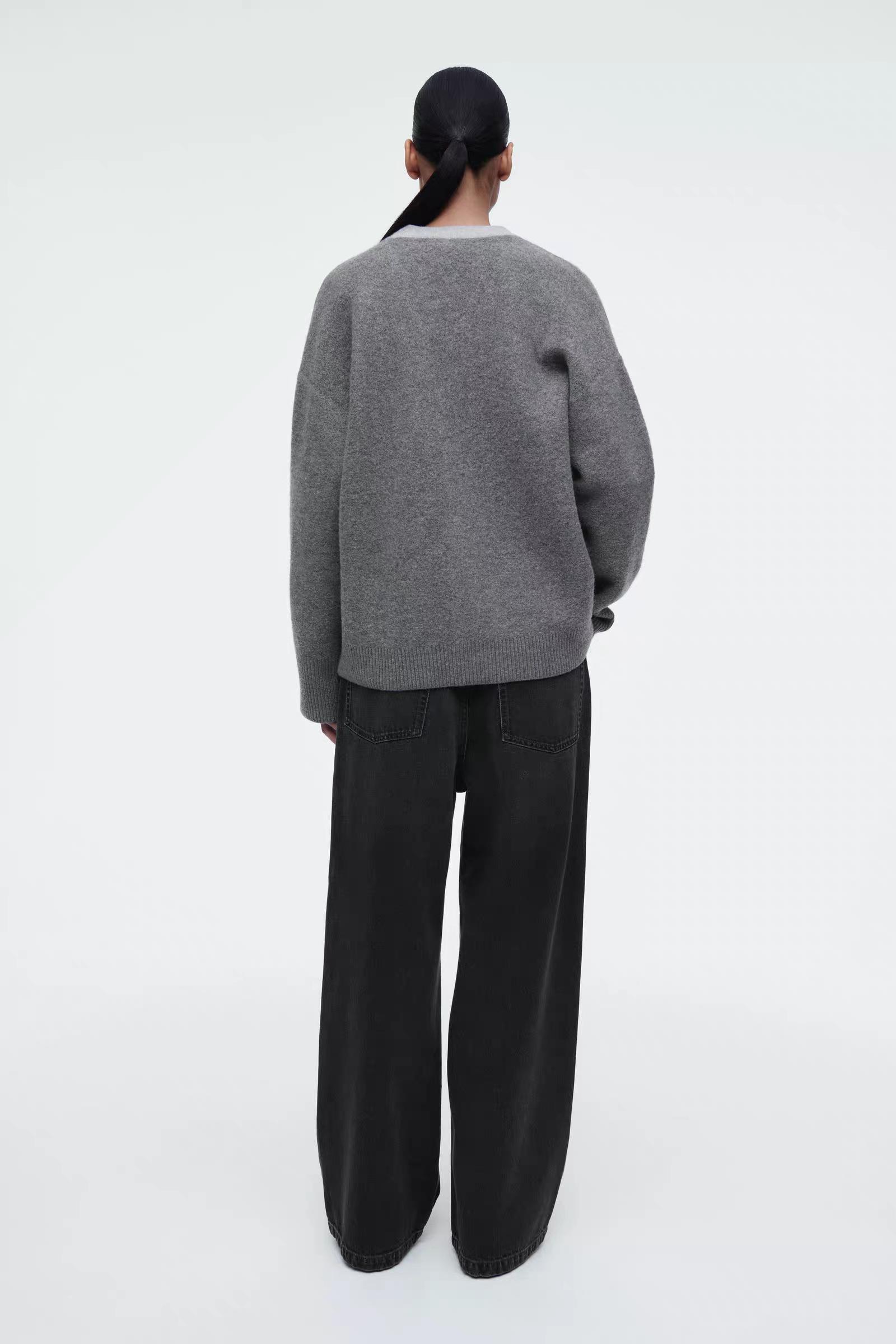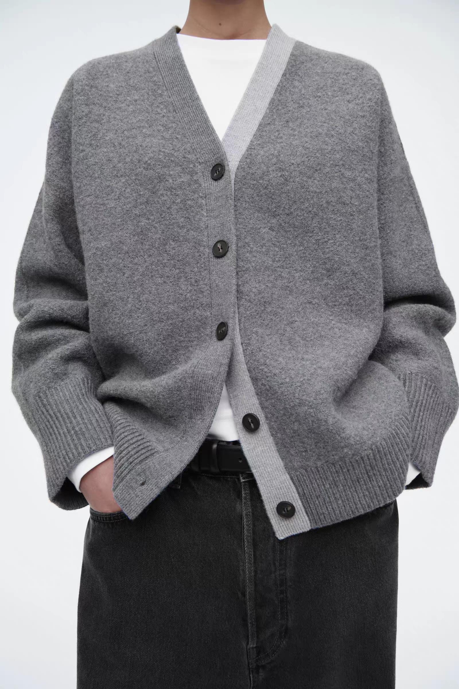 Артикул: 1258542001 Состав:100% шерсть Свитер в тонких оттенках серого изготовлен из чистой шерсти, сертифицированного RWS. Он имеет свободный крой и двухцветные лацканы. -Свободный фасон; Длина спереди для размера S составляет 55 см / Модель одета в размер S