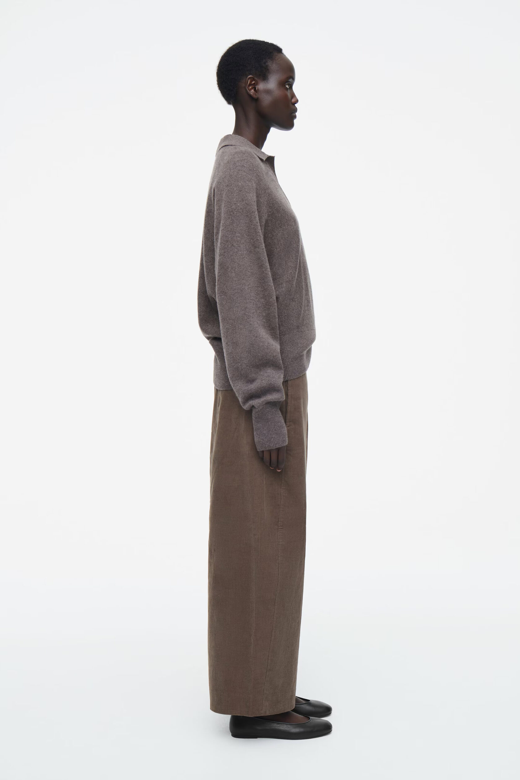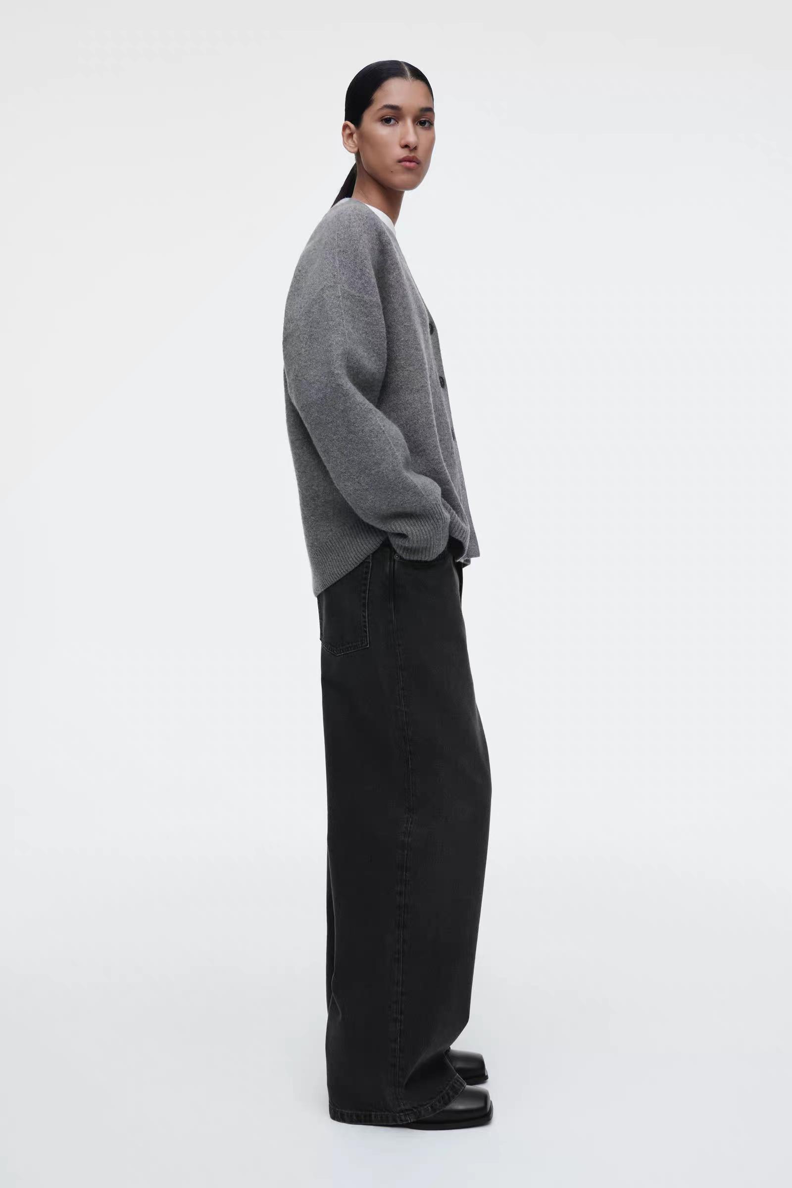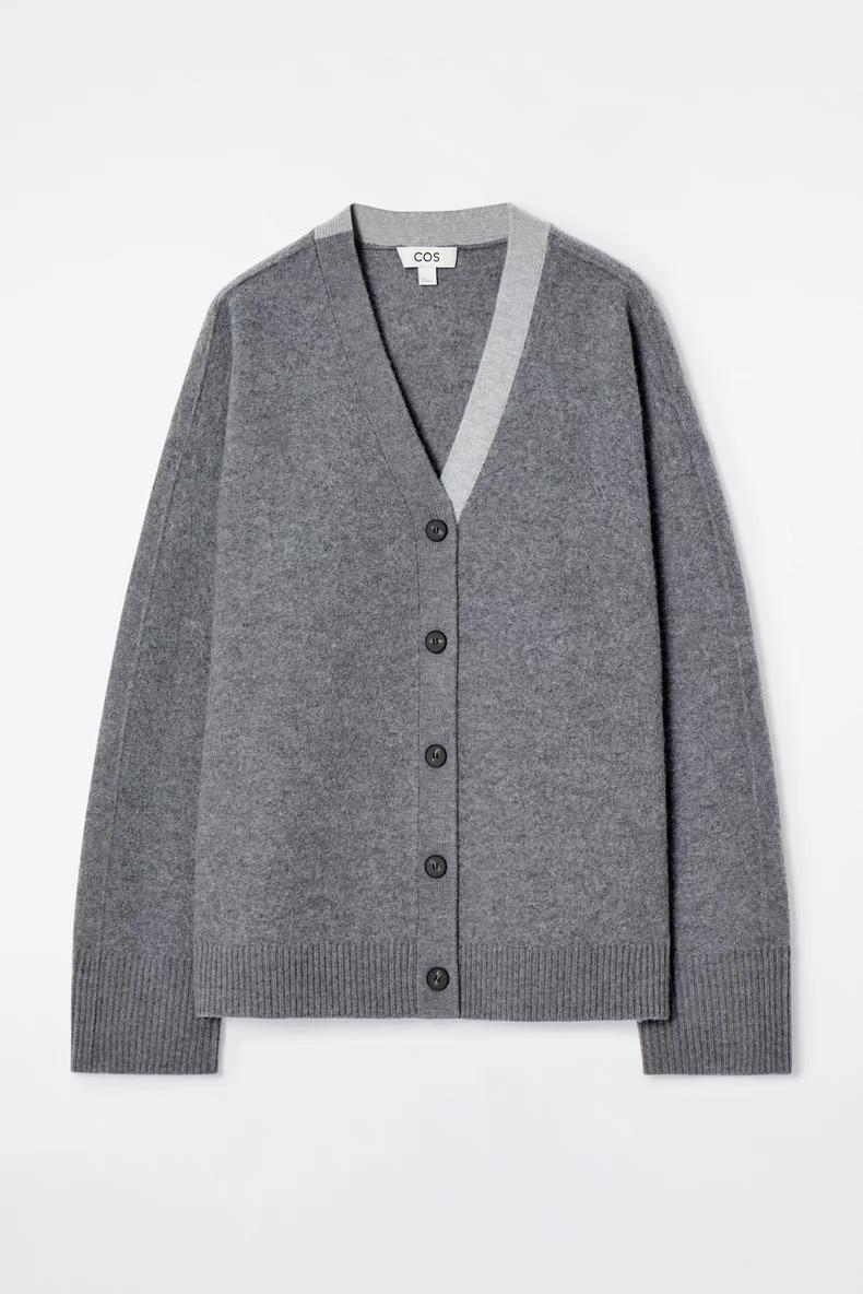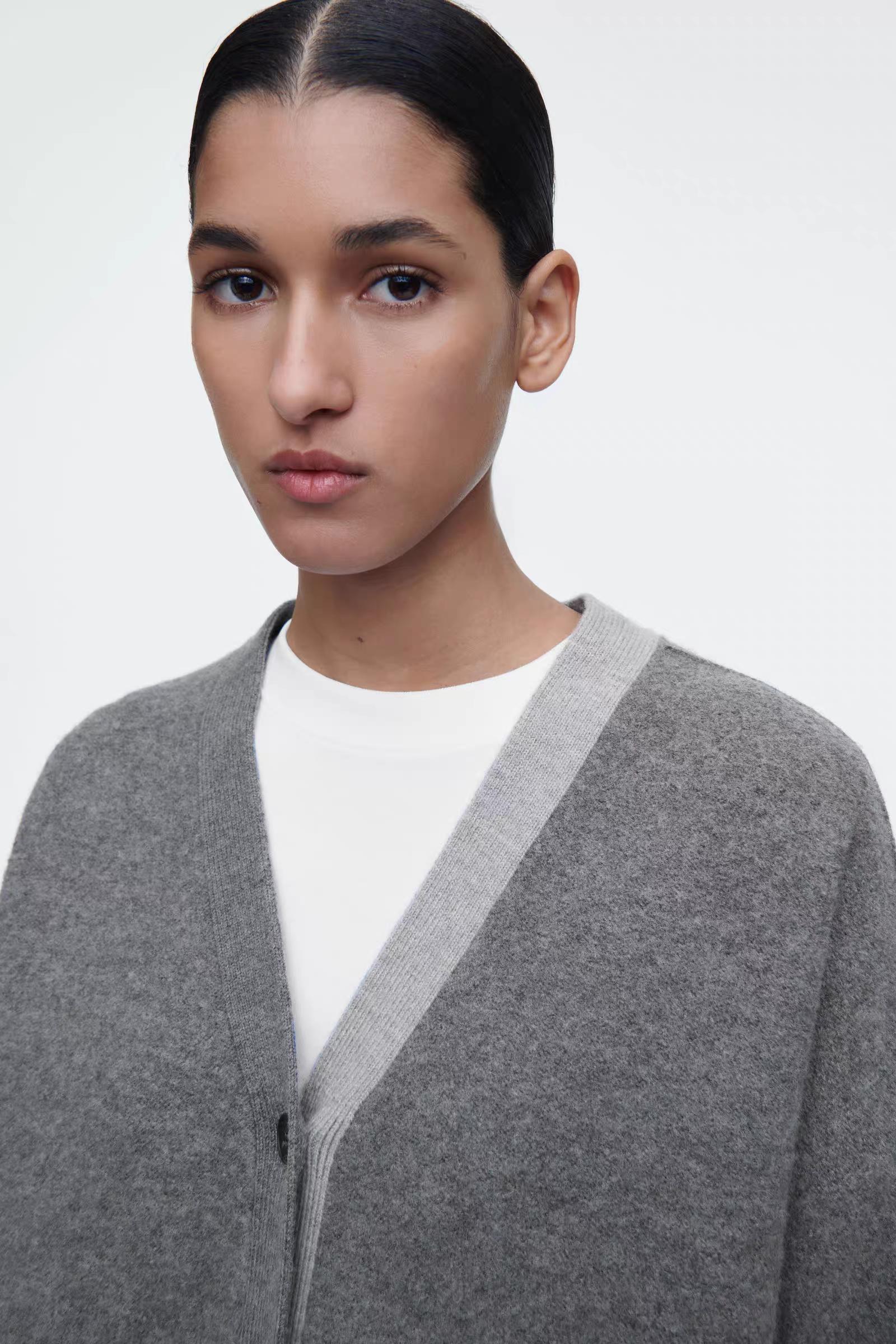 Артикул: 1258542001 Состав:100% шерсть Свитер в тонких оттенках серого изготовлен из чистой шерсти, сертифицированного RWS. Он имеет свободный крой и двухцветные лацканы. -Свободный фасон; Длина спереди для размера S составляет 55 см / Модель одета в размер S